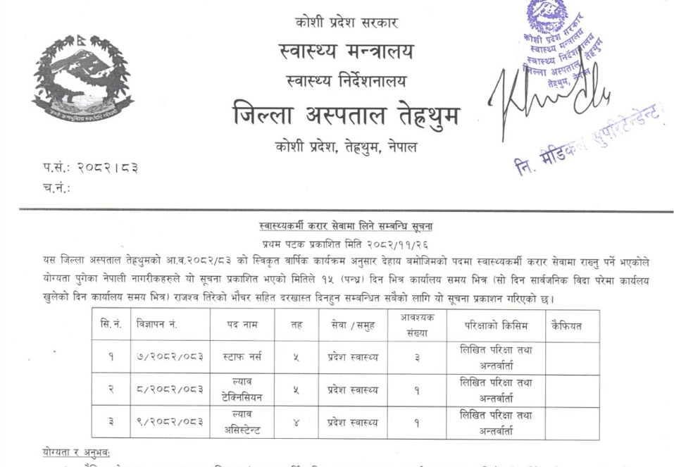 Terhathum District Hospital Vacancies for Staff Nurse, Lab Technician and Lab Assistant