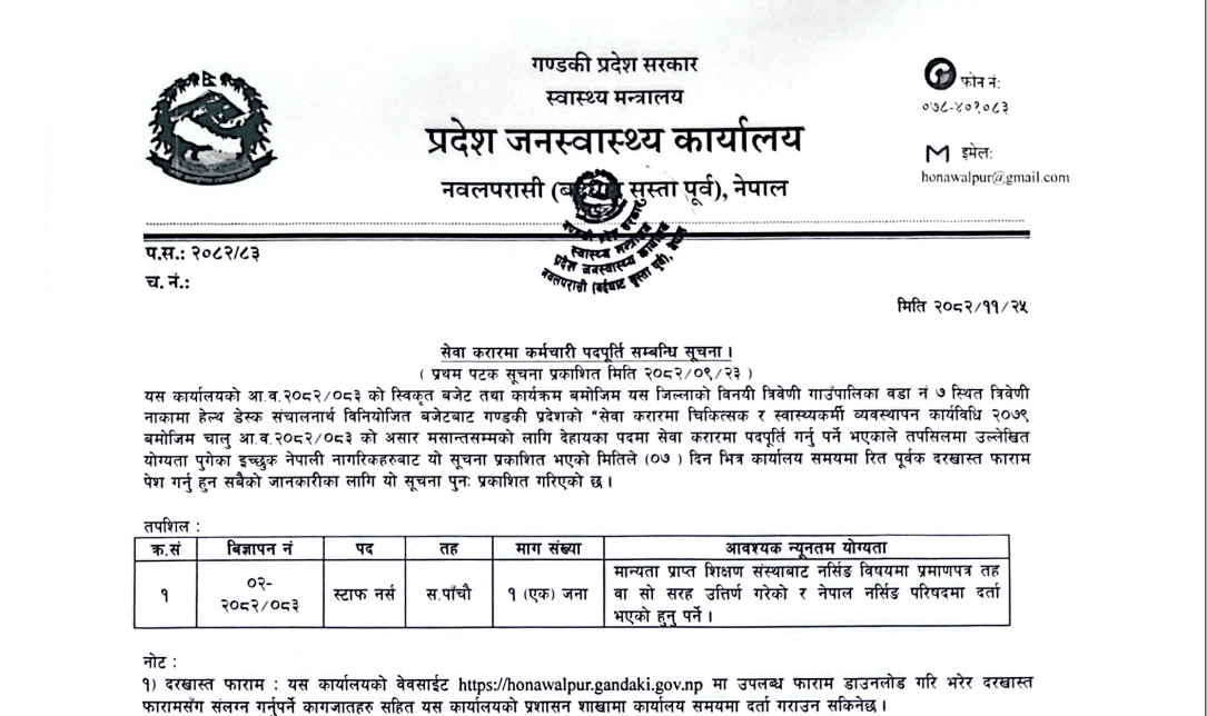 Province Health Office Nawalpur, Vacancies for Staff Nurse