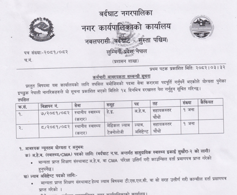 बर्दघाट नगरपालिकामा कर्मचारी आवश्यकता सम्बन्धी सूचना
