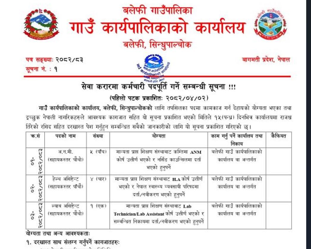 बलेफी गाउँपालिकामा कर्मचारी आवश्यकता सम्बन्धी सूचना
