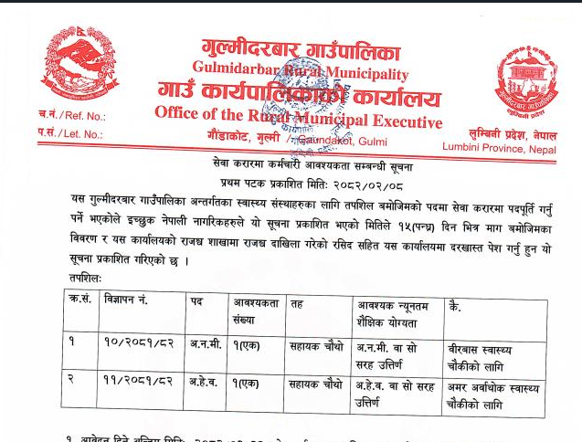 Gulmidarbar Rural Municipality Vacancy for ANM and AHW