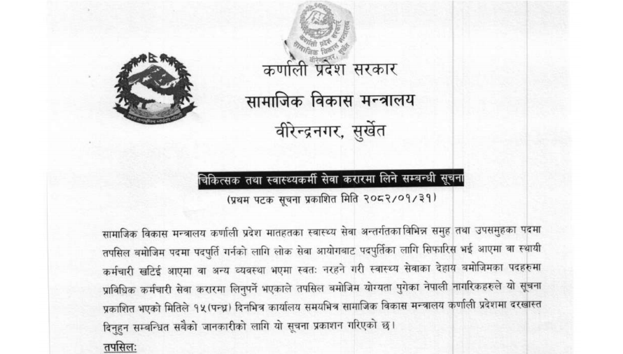 कर्णाली प्रदेश सामाजिक विकास मन्त्रालय चिकित्सक तथा स्वास्थ्यकर्मी सेवा करार लिने सम्बन्धी सूचना
