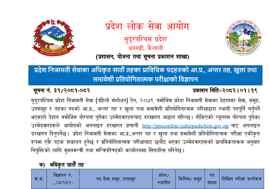 सु.प. लोक सेवा आयोगकाे सातौँ तहका विभिन्न प्राविधिक तथा अप्राविधिक पदकाे विज्ञापन