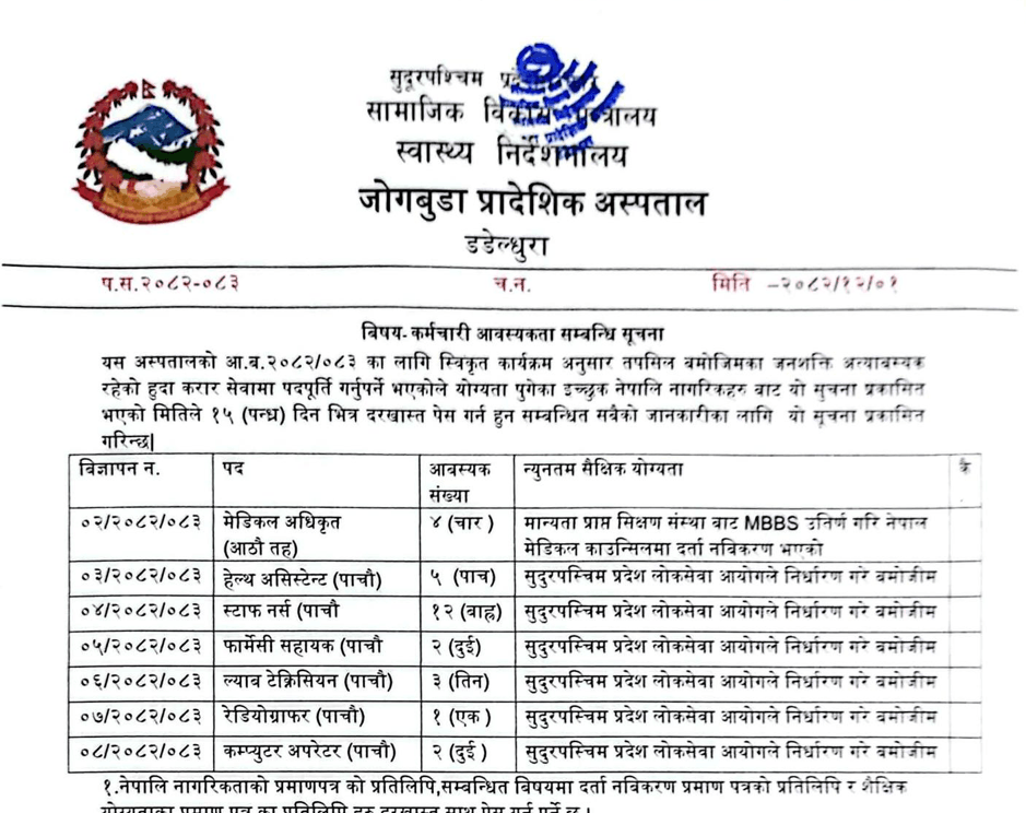 जोगबुडा प्रादेशिक अस्पताल डडेल्धुरामा विशेषज्ञ डाक्टर सहित ३० जना कर्मचारी आवश्यकता सम्बन्धी सूचना