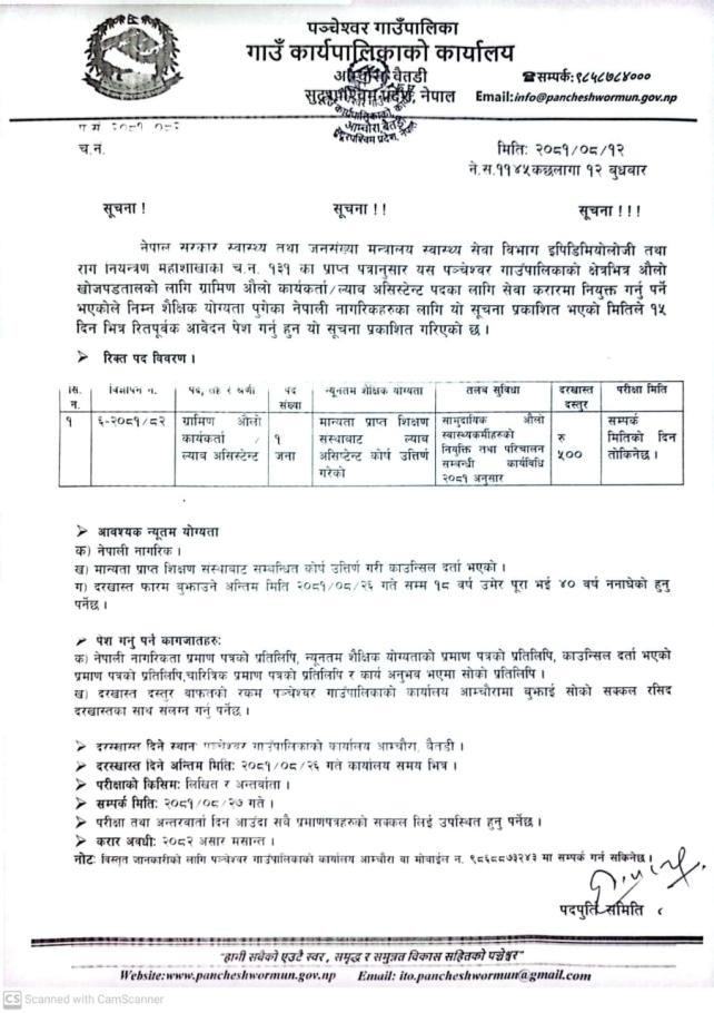 पञ्चेश्वर गाउँपालिका बैतडीमा ल्याब असिष्टेन्ट करार सेवामा पदपूर्ती गर्ने सम्बन्धी सूचना