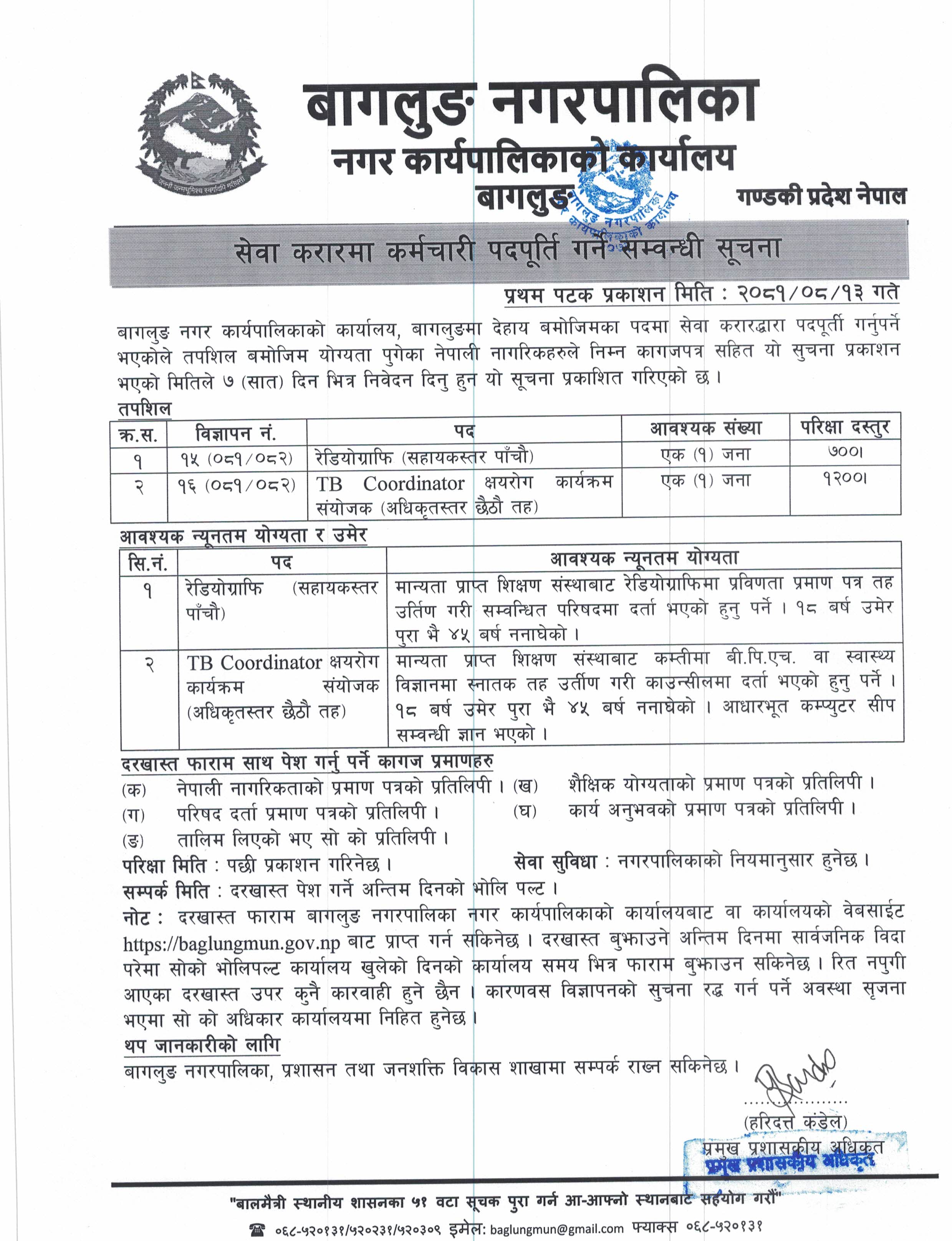 बागलुङ नगरपालिकामा कर्मचारी आवश्यकता सम्बन्धी सूचना
