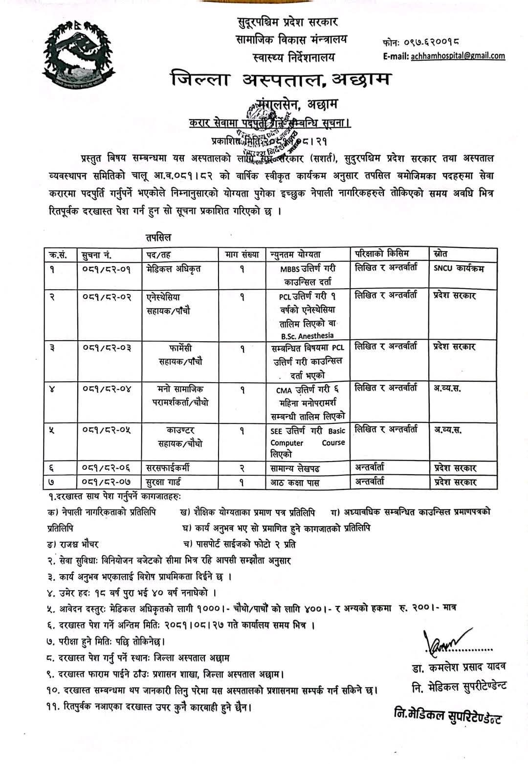 जिल्ला अस्पताल अछाममा कर्मचारी आवश्यकता सम्बन्धी सूचना