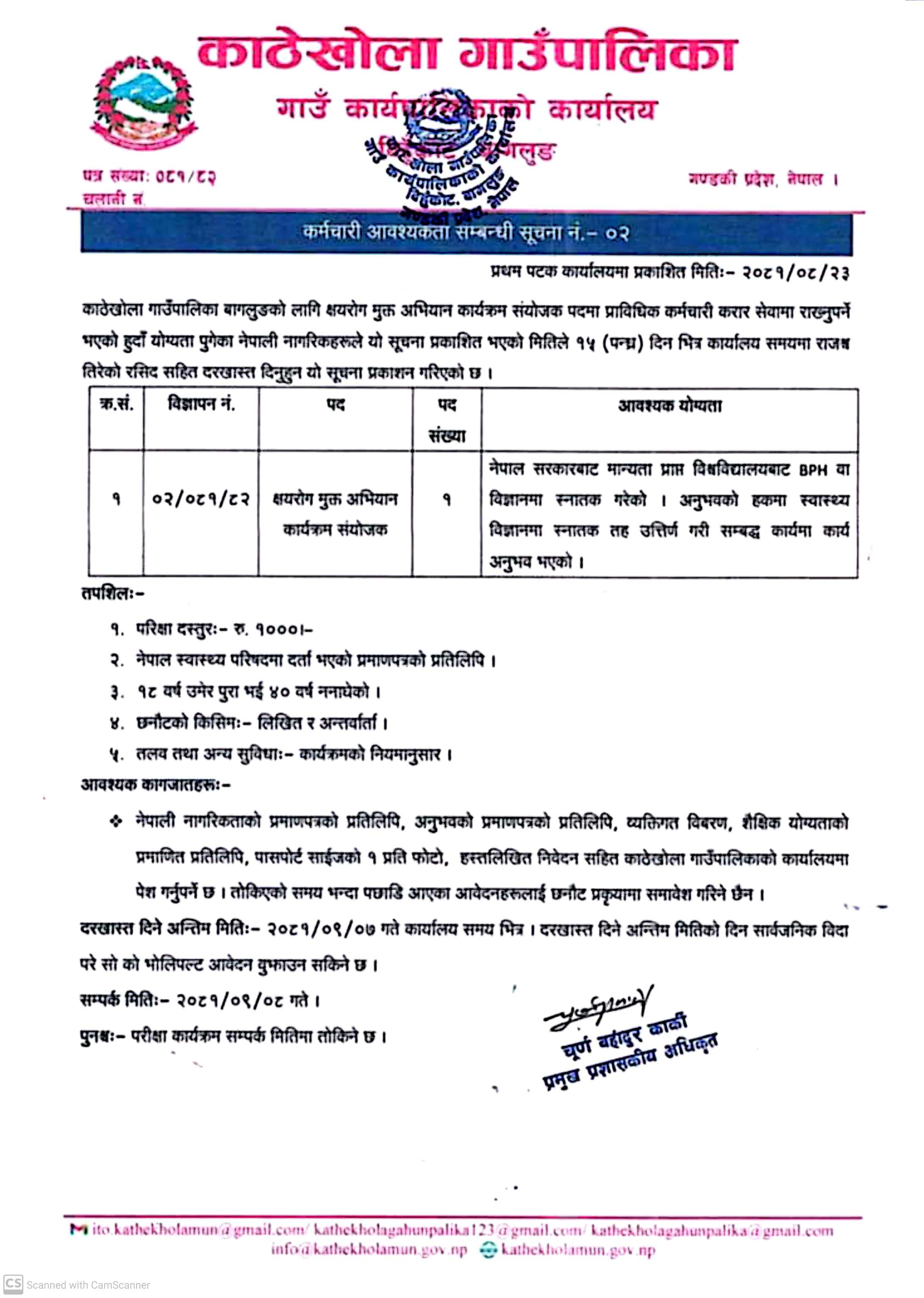 काठेखोला गाउँपालिकामा क्षयरोगमुक्त अभियान संयोजकका लागि कर्मचारी आवश्यकता सम्बन्धी सूचना