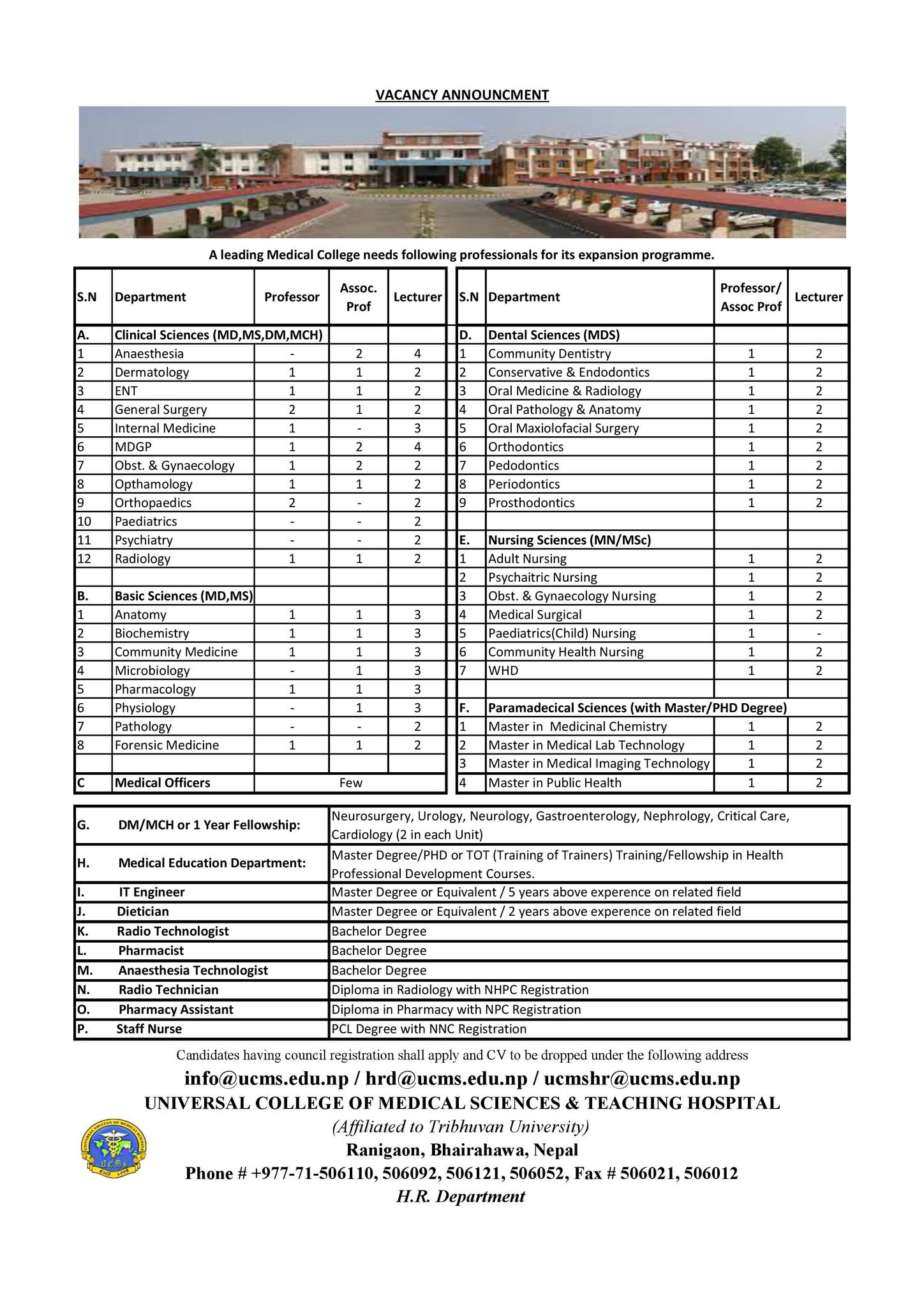 Vacancy Announcement at Universal College of Medical Sciences and Teaching Hospital
