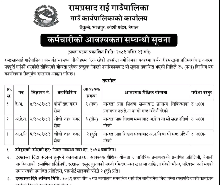 रामप्रसादराई गाउँपालिकामा स्वास्थ्यकर्मी आवश्यकता सम्बन्धी सूचना !