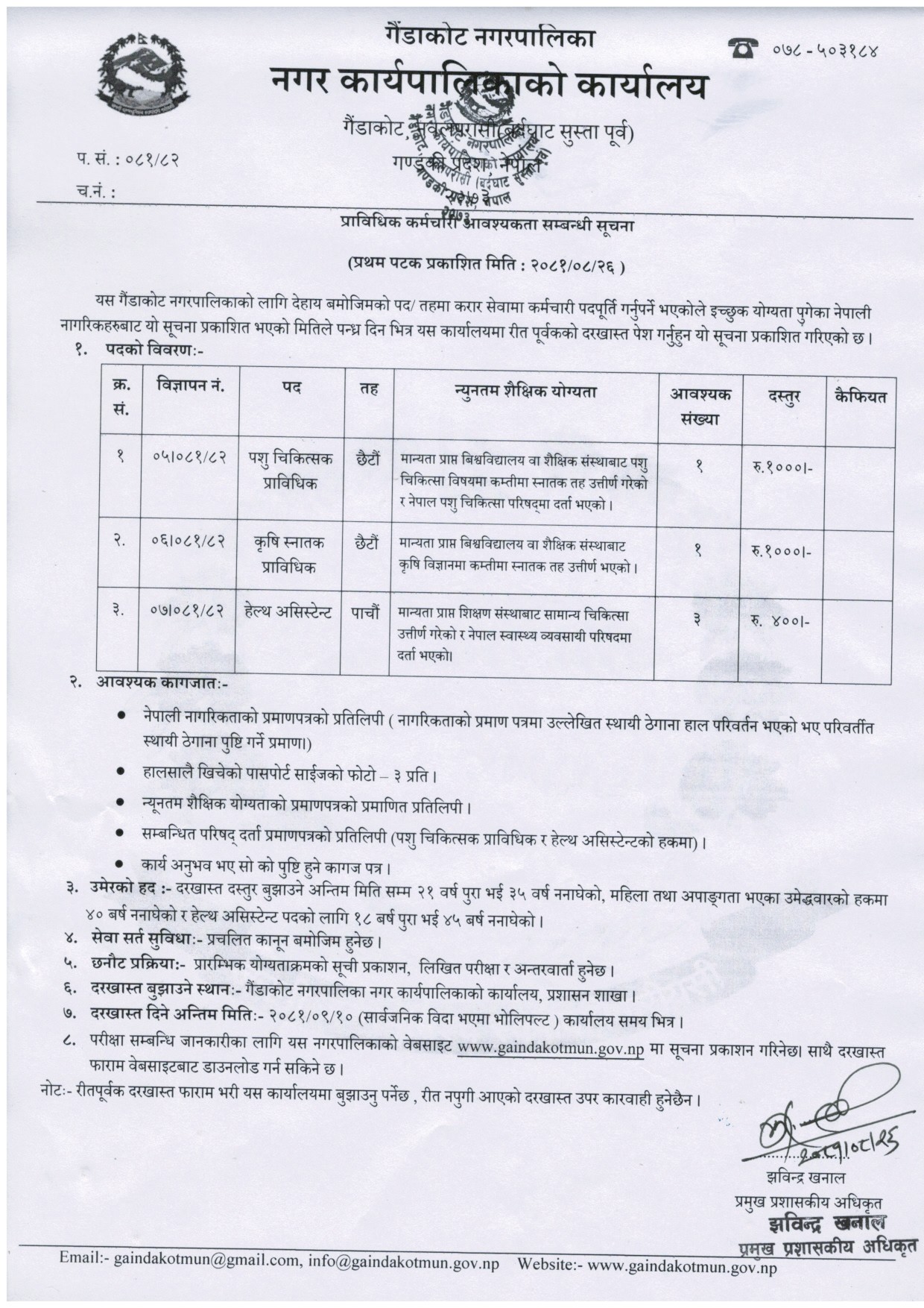 गैँडाकोट नगरपालिकामा कर्मचारी आवश्यकता सम्बन्धी सूचना