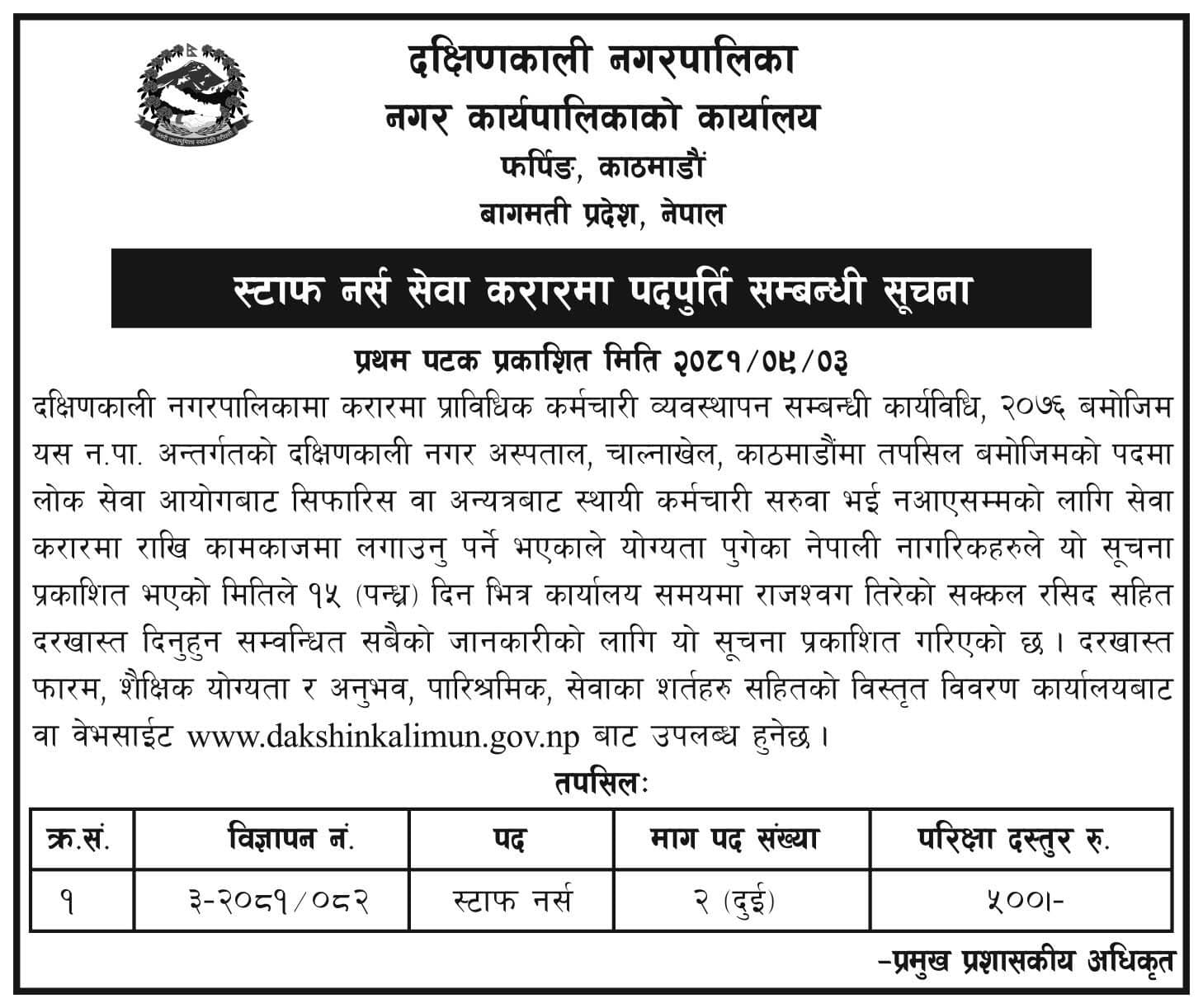 दक्षिणकाली नगरपालिकामा स्टाफ नर्स आवश्यकता सम्बन्धी सूचना