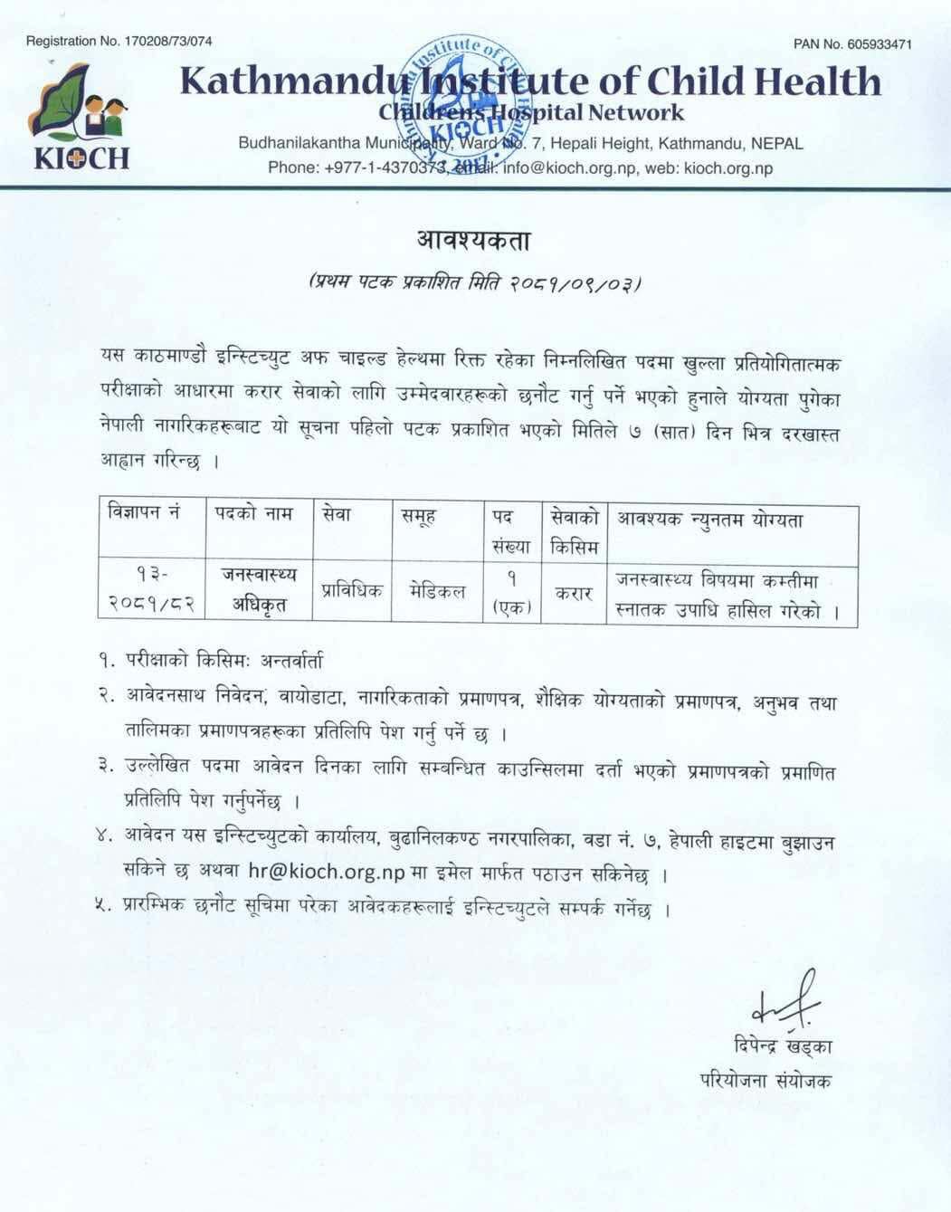 KIOCH मा जनस्वास्थ्य अधिकृत आवश्यकता सम्बन्धी सूचना