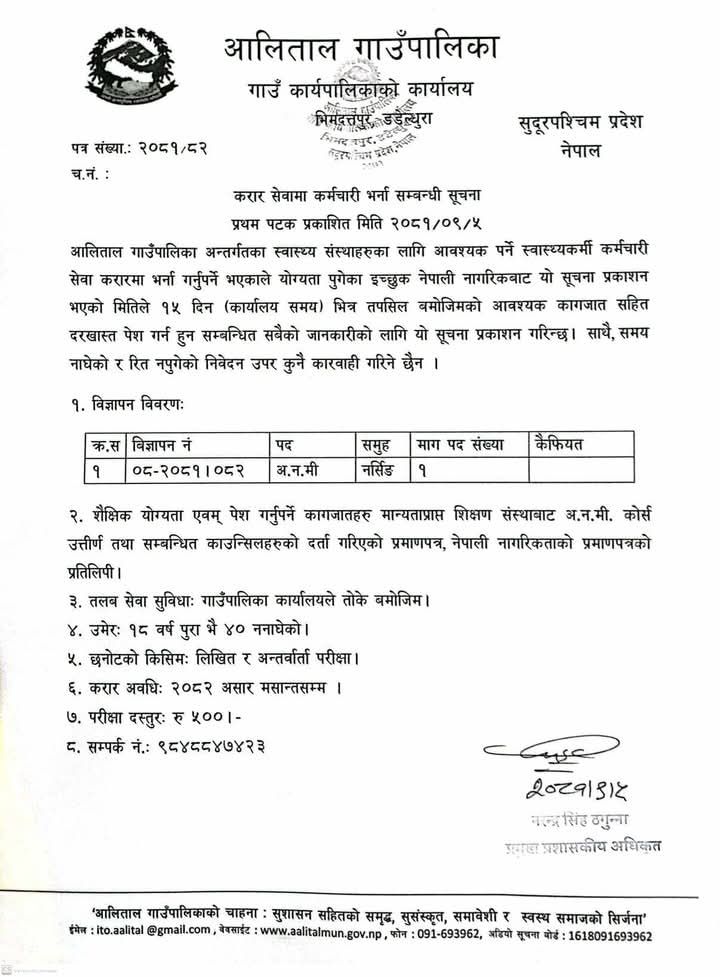 आलीताल गाउँपालिकामा अ.न.मी. आवश्यकता सम्बन्धी सूचना