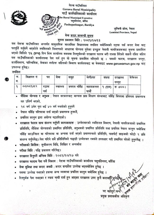 गेरुवा गाउँपालिकाको स्टाफ नर्स करार सेवा बाट पदपूर्ति गर्ने सम्बन्धी सूचना