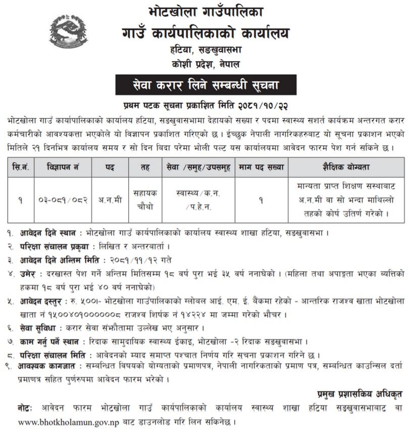 भोटेखोला गाउँपालिकामा अ.न.मी. आवश्यकता सम्बन्धी सूचना