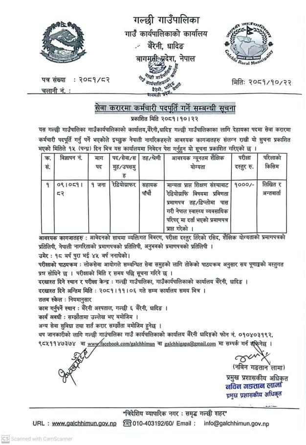 गल्छी गाउँपालिका बैरेनी धादिङको सेवा करारमा रेडियोग्राफर पदपूर्ति गर्ने सम्बन्धी सूचना