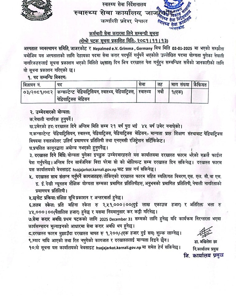 स्वास्थ्य सेवा कार्यालय जाजरकोटमा चिकित्सक आवश्यता सम्बन्धी सूचना