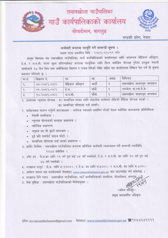 तमानखोला गाउँपालिकामा कर्मचारी आवश्यकता सम्बन्धी सूचना