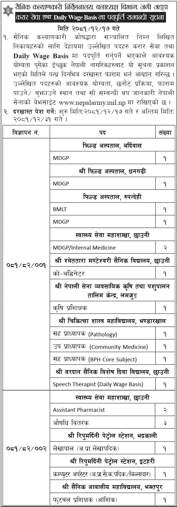सैनिक कल्याणकारी निर्देशनालय, बलाध्यक्ष बिभाग, जंगी अड्डा करार सेवा तथा Daily Wage Basis मा पदपुर्ति सम्बन्धी सूचना