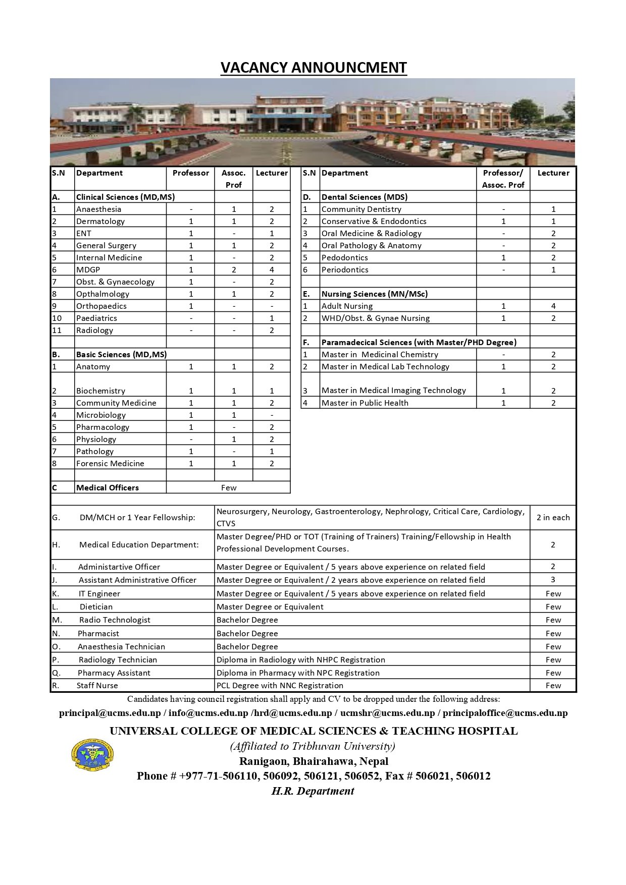 Universal College of Medical Sciences Vacancy for Various Posts