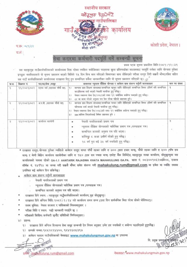 महाकुलुङ गाउँपालिका सोलुखुम्बुमा कर्मचारी आवश्यकता सम्बन्धी सूचना