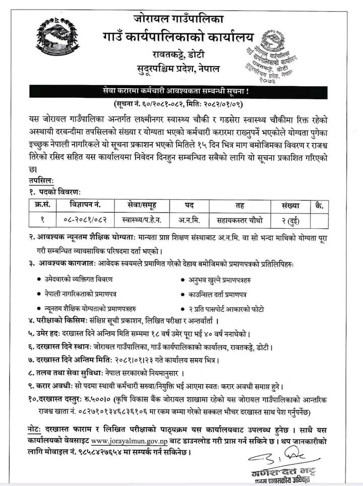 Jorayal Rural Municipality Vacancy for ANM