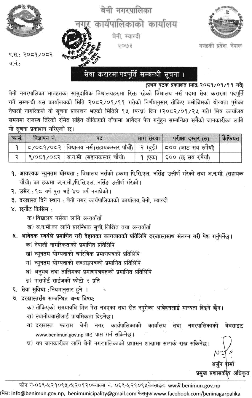 Beni Municipality Vacancy for School Nurse and ANM