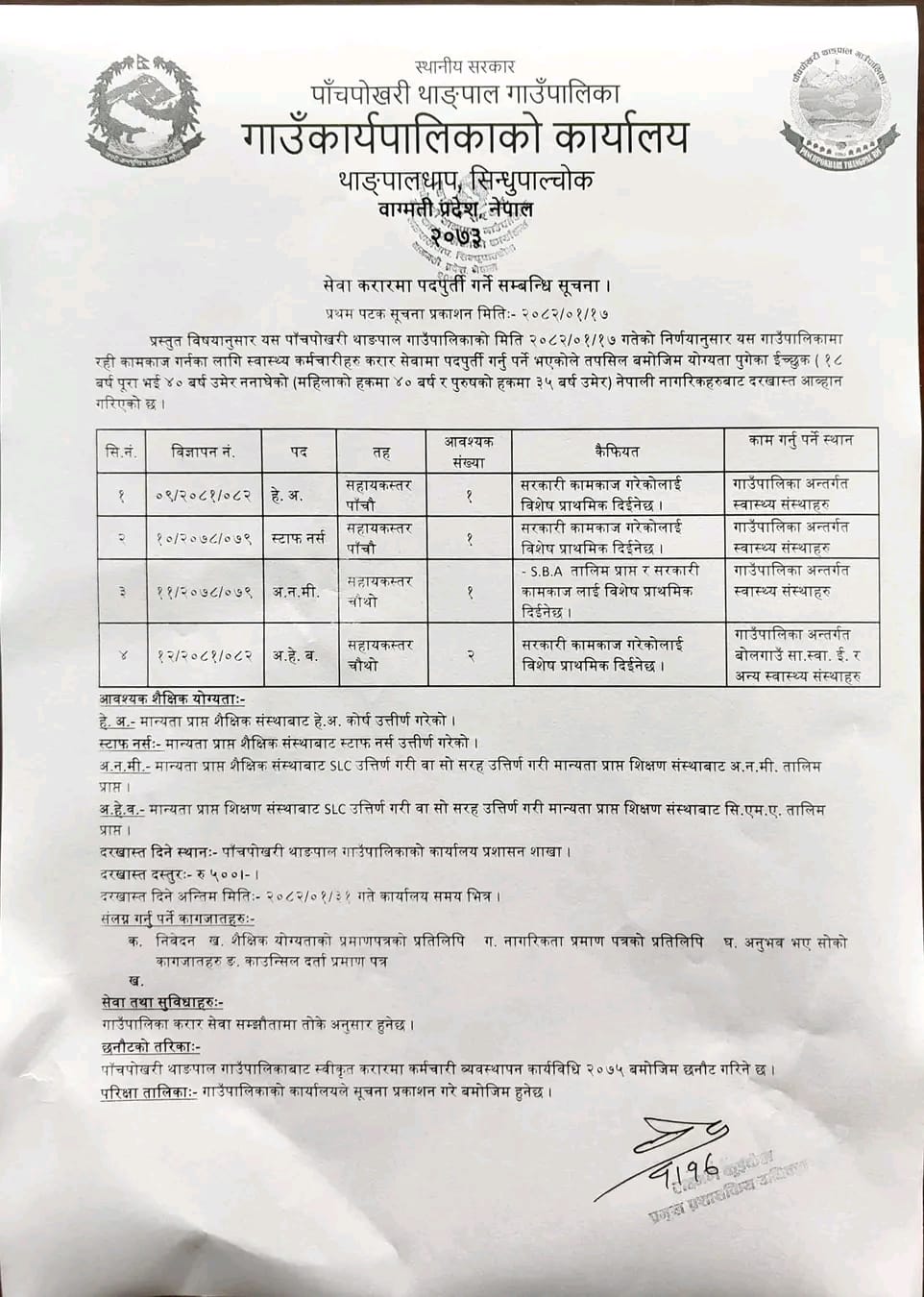 Panchpokhari Thangpal Rural Municipality vacancy for HA, AHW, ANM and Staff Nurse