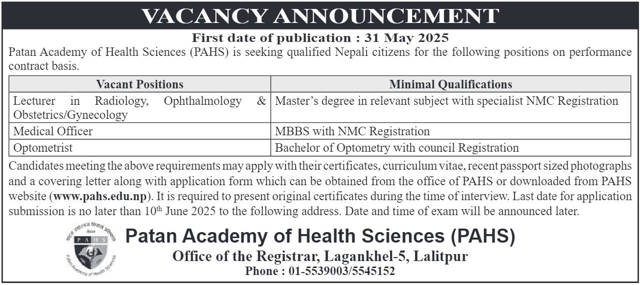 Patan Academy of Health Sciences (PAHS) is seeking qualified Nepali citizens for the following positions on performance contract basis.