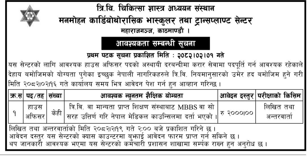 Vacancy Notice for House Officer Post at Manmohan Cardiothoracic Vascular & Transplant Center