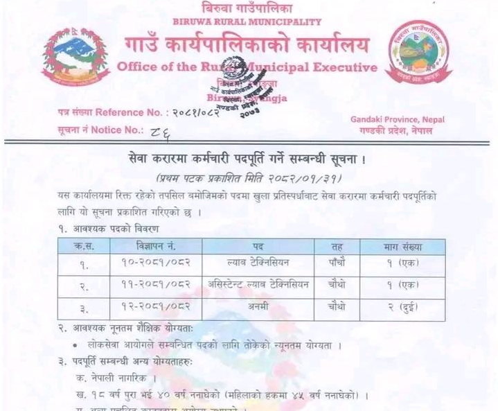 बिरुवा गाउँपालिकामा स्वास्थ्यकर्मी आवश्यकता सम्बन्धी सूचना