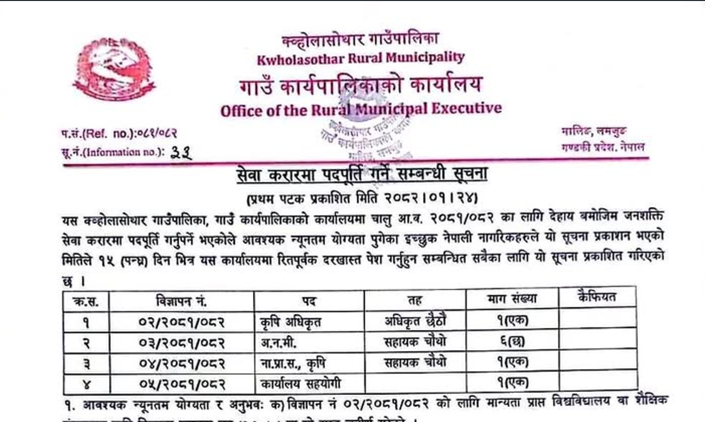 क्व्होलासोथार गाउँपालिका लमजुङमा अ.न.मी. (६ जना) लगायतका कर्मचारी आवश्यकता
