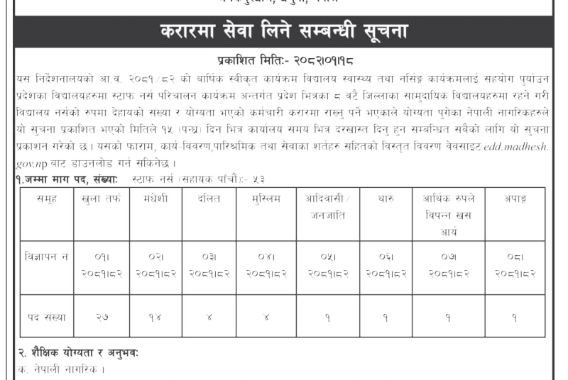 मधेश प्रदेश शिक्षा विकास निर्देशनलायमा ५३ जना स्टाफ नर्स आवश्यकता सम्बन्धी सूचना