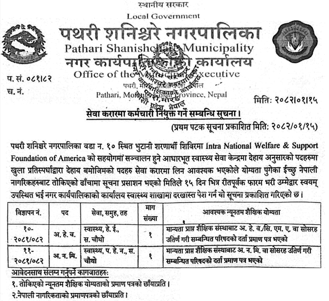 Pathari Shanishchare Nagarpalika, Morang Vacancy for AHW and ANM