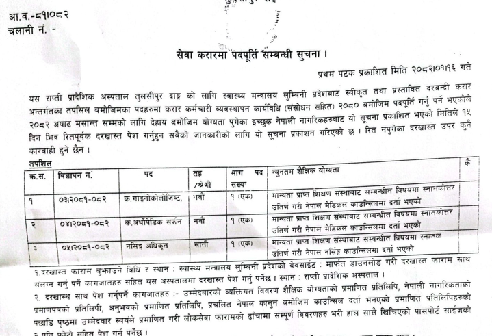 राप्ती प्रादेशिक अस्पताल, तुलसीपुर दाङमा कर्मचारी आवश्यकता