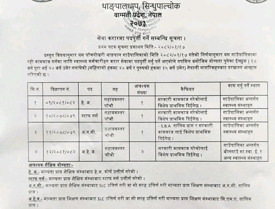 Panchpokhari Thangpal Rural Municipality vacancy for HA, AHW, ANM and Staff Nurse