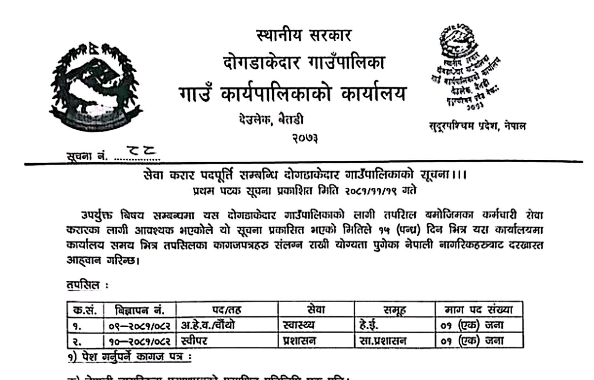 दोगडाकेदार गाउँपालिकामा कर्मचारी आवश्यकता सम्बन्धी सूचना