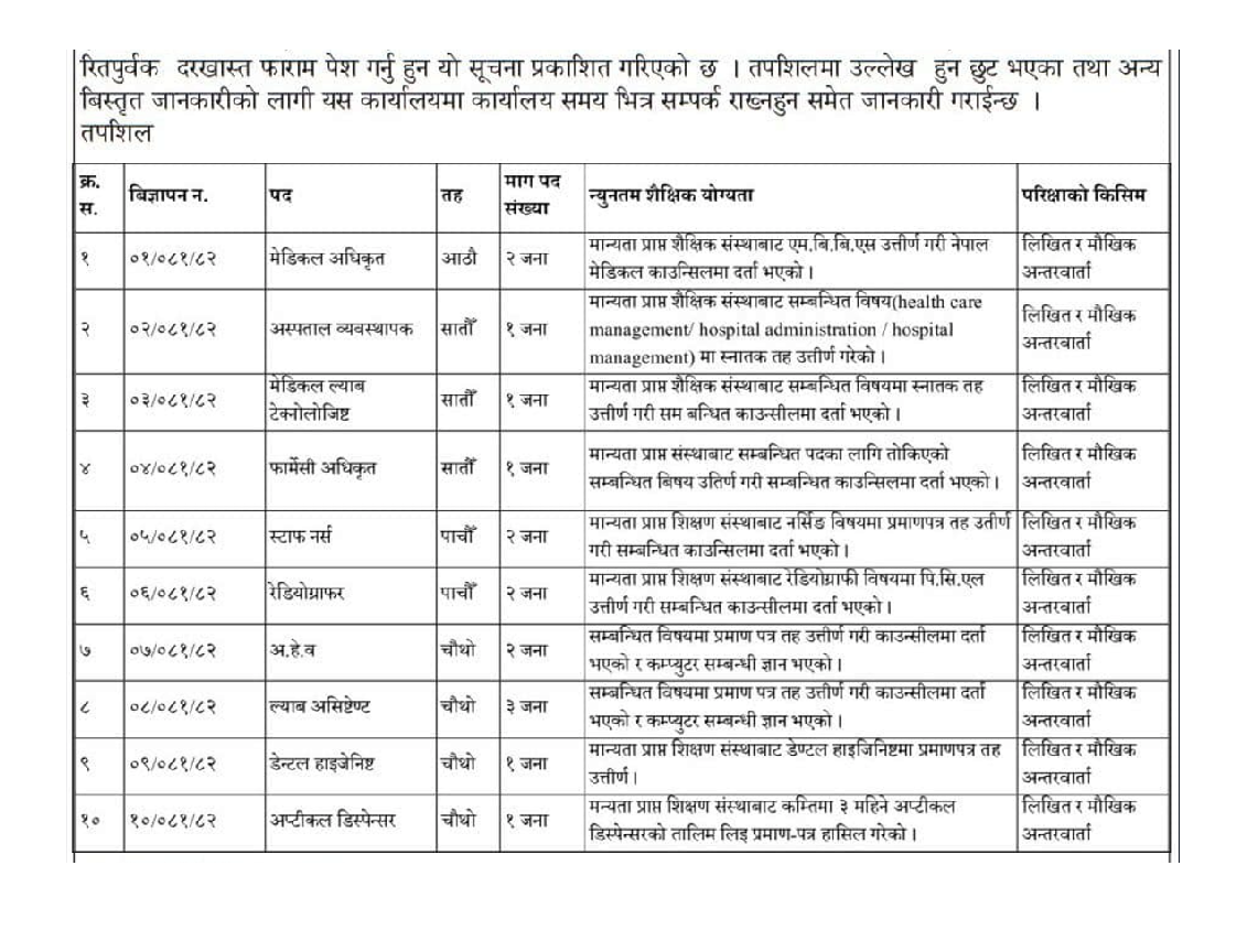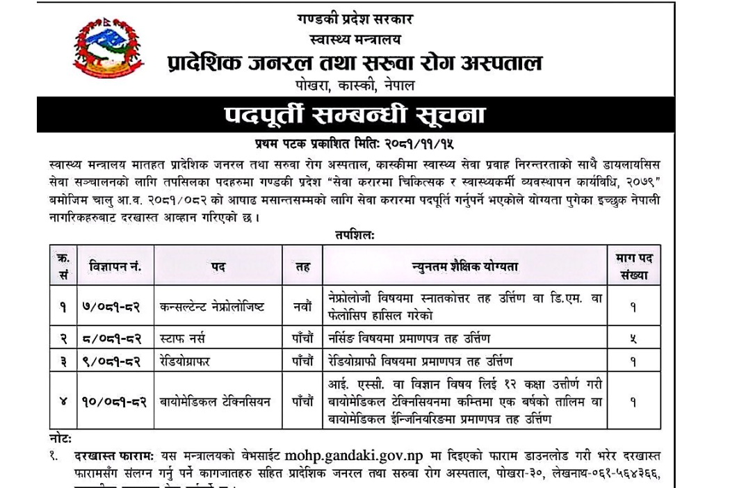 गण्डकी प्रदेश, प्रादेशिक जनरल तथा सरुवा रोग अस्पतालमा कर्मचारी आवश्यकता सम्बन्धी सूचना