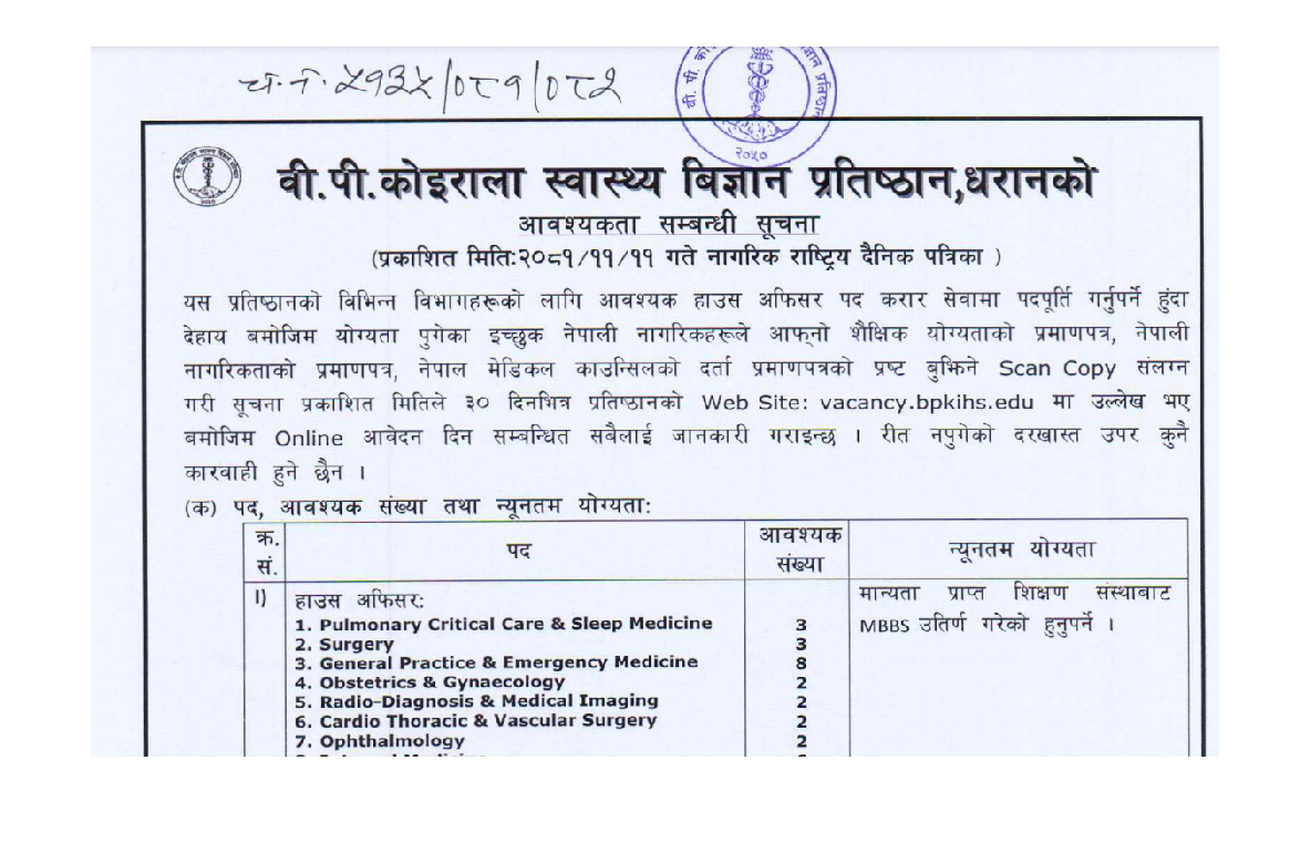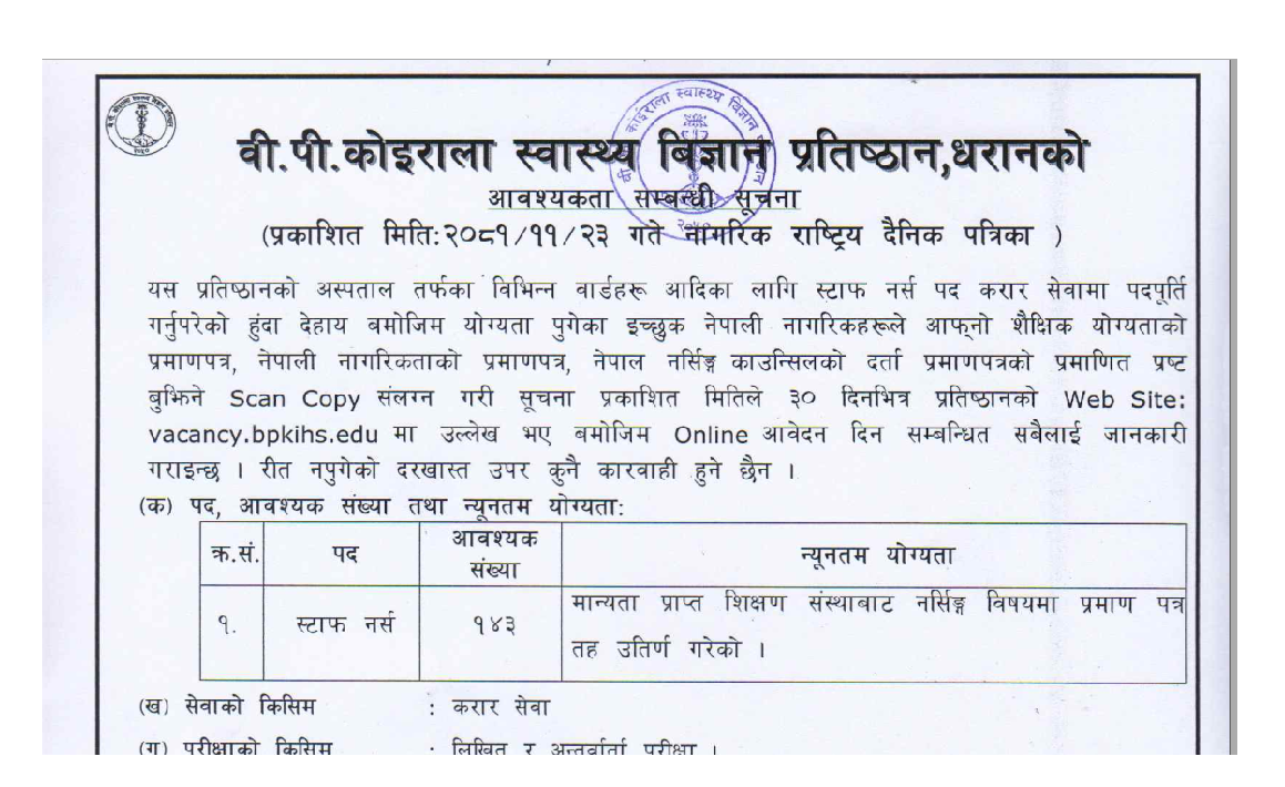 वी.पी. कोइराला स्वास्थ्य विज्ञान प्रतिष्ठान, धरानमा १४३ जना स्टाफ नर्स आवश्यकता सम्बन्धी सूचना