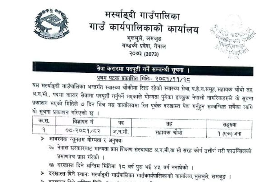 मर्स्याङ्दी गाउँपालिका लमजुङमा अ.न.मी. आवश्यकता सम्बन्धी सूचना