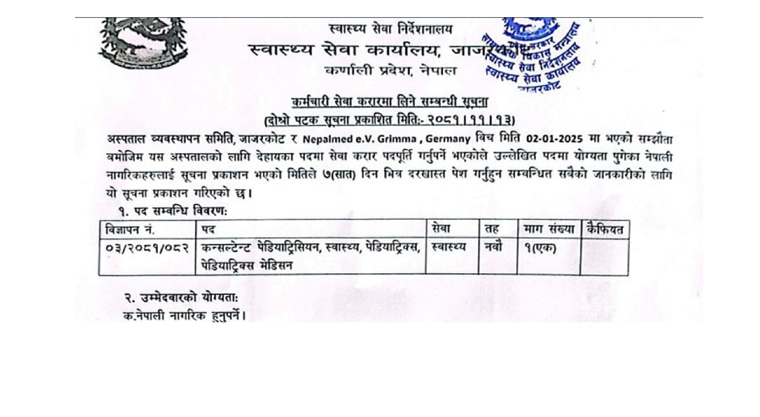 स्वास्थ्य सेवा कार्यालय जाजरकोटमा चिकित्सक आवश्यता सम्बन्धी सूचना