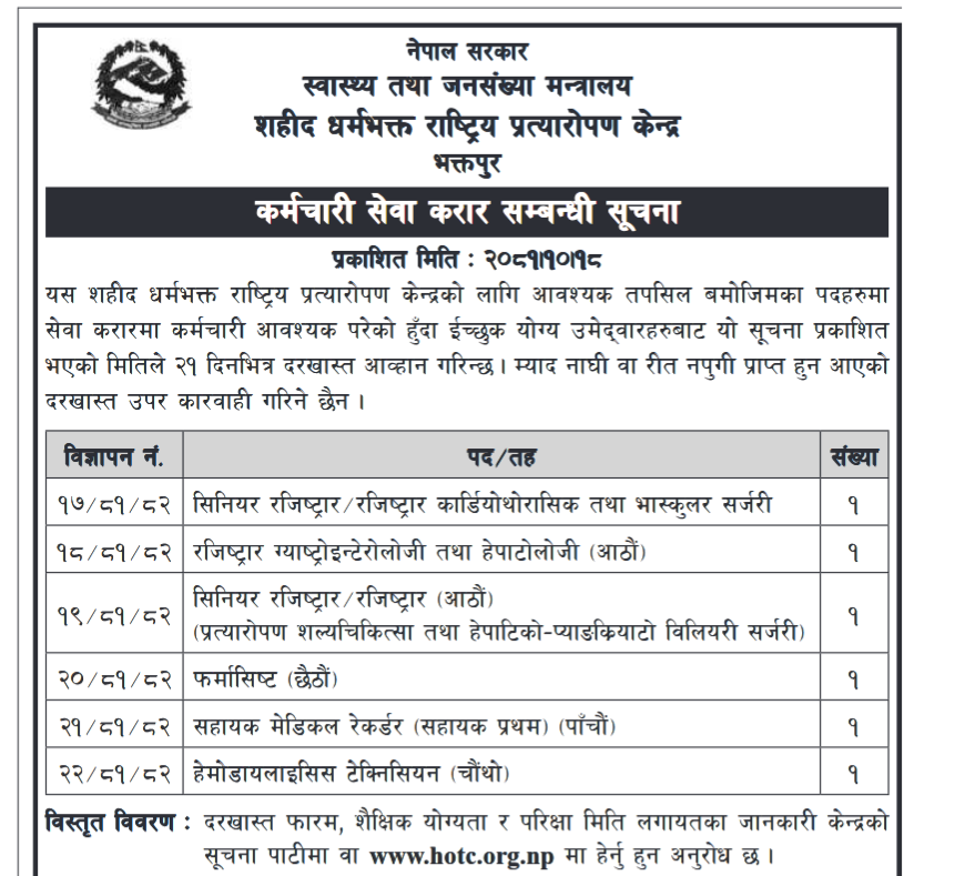 शहीद धर्मभक्त राष्ट्रिय प्रत्यारोपण केन्द्र भक्तपुरमा कर्मचारी आवश्यकता सम्बन्धी सूचना