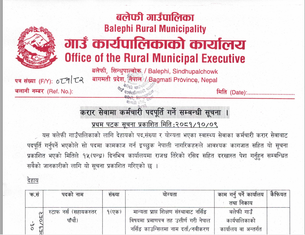 बलेफी गाउँपालिका सिन्धुपाल्चोकमा स्टाफ नर्स आवश्यकता