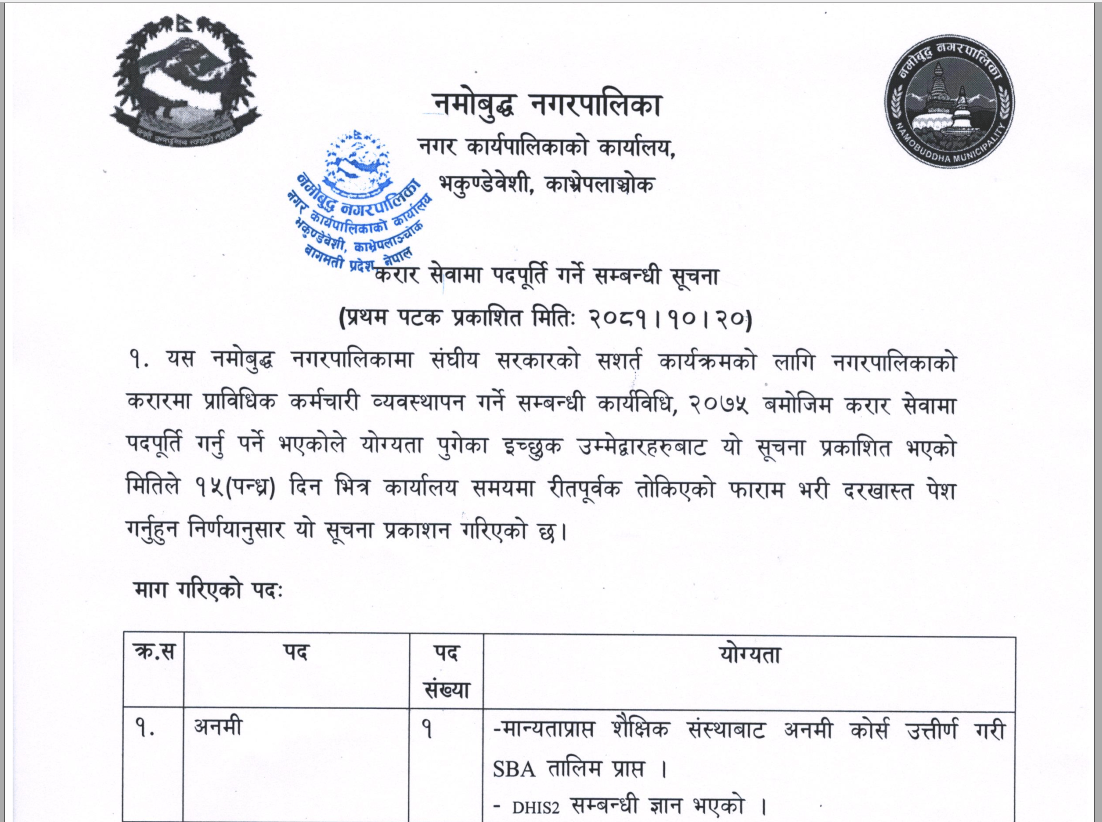 नमोबुद्ध नगरपालिका काभ्रेपलान्चोकमा अ.न.मी. आवश्यकता सम्बन्धी सूचना