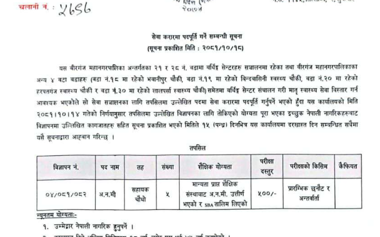वीरगंज महानगरपालिकामा ५ जना अ.न.मी. आवश्यकता सम्बन्धी सूचना