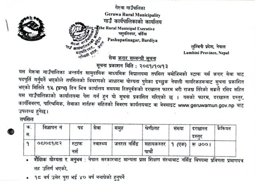 गेरुवा गाउँपालिकाको स्टाफ नर्स करार सेवा बाट पदपूर्ति गर्ने सम्बन्धी सूचना