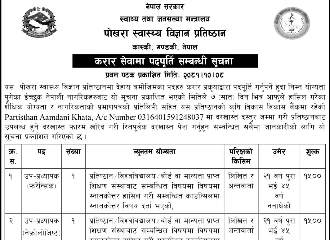 पोखरा स्वास्थ्य विज्ञान प्रतिष्ठानको करार सेवामा पदपूर्ति सम्बन्धी सूचना