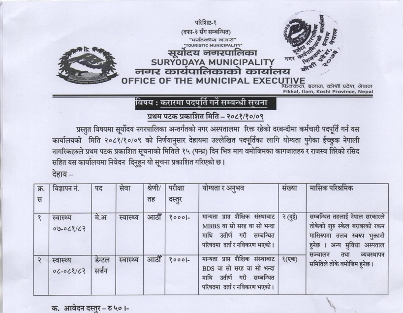 सूर्योदय नगरपालिकामा कर्मचारी आवश्यकता सम्बन्धी सूचना