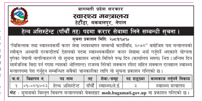 बागमती प्रदेश स्वास्थ्य मन्त्रालयमा हे.अ.आवश्यकता सम्बन्धी सूचना